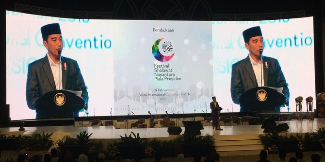 Penyalainews, Jakarta - Presiden Joko Widodo (Jokowi) membuka festival sholawat nusantara piala presiden di Sentul International Convention Center (SICC), Babakan Madang, Cipambuan, Bogor, Sabtu (24/2). Pantauan merdeka.com, Jokowi tiba pukul 19.46 WIB. Presiden mengenakan jas lengkap dan sarung berwarna ungu.