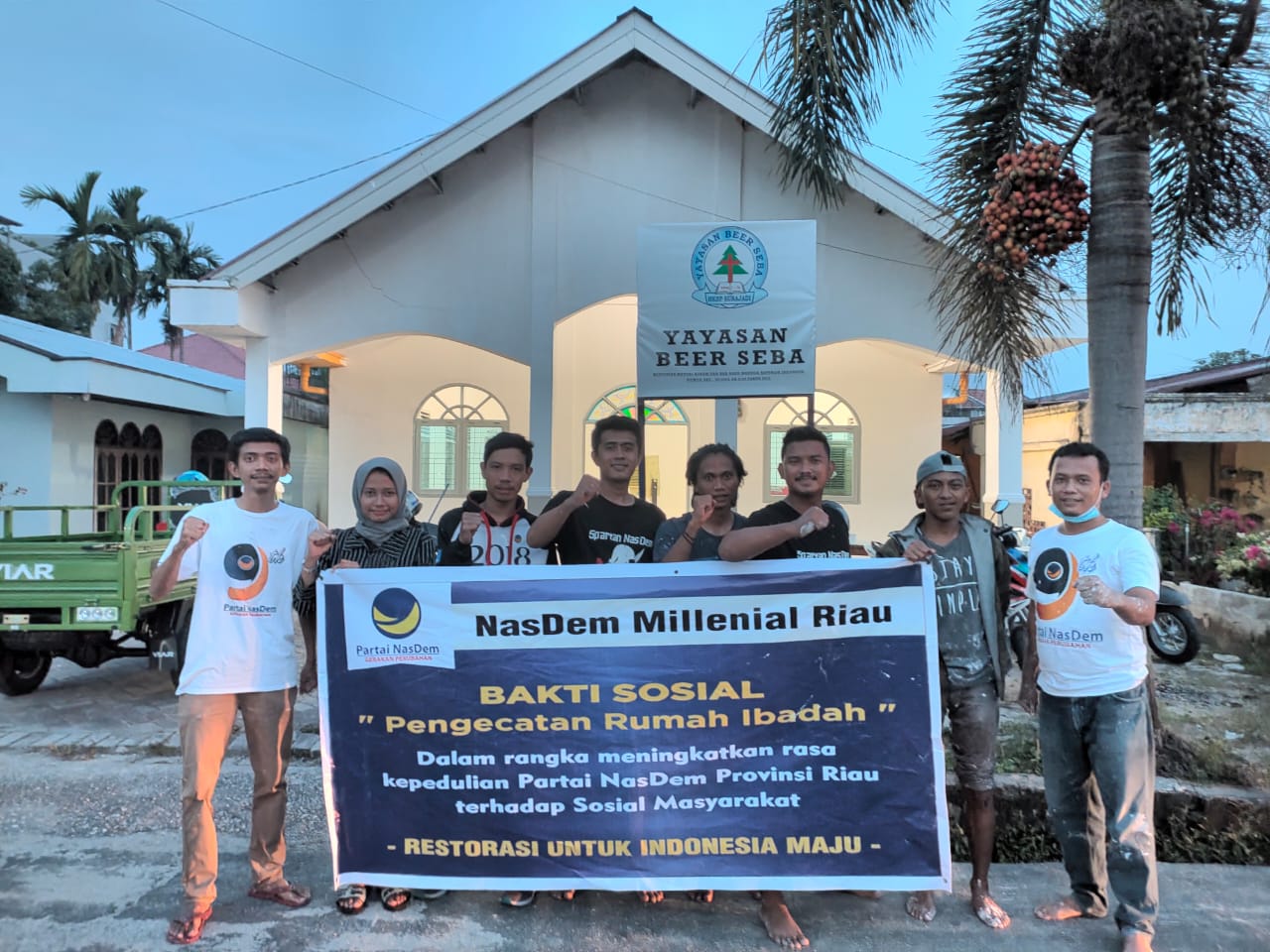 Penyalainews, Pekanbaru - Dengan penuh semangat dan kompak, kader kader Milenial Partai NasDem Provinsi Riau melakukan kegiatan bakti sosial Pengecatan Rumah Ibadah.