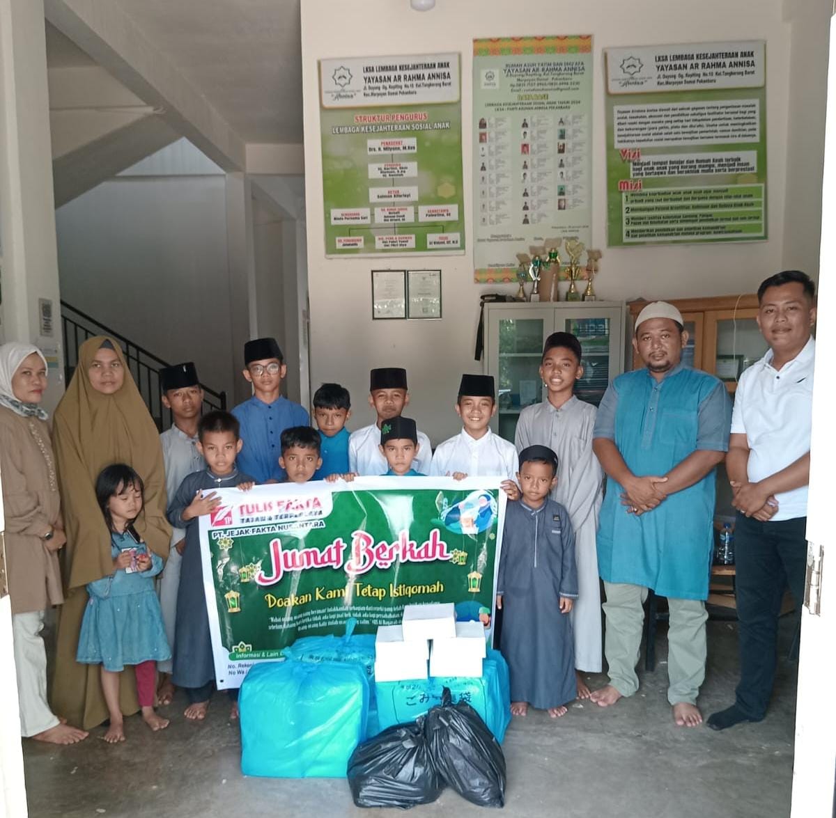 Penyalainews, Pekanbaru - Di bawah naungan PT Jejak Fakta Nusantara Media (PT JFN Media), mengadakan acara "Jumat Berkah". Dalam acara ini, mereka memberikan Nasi Kotak dan sembako kepada anak-anak di Yayasan Ar-Rahman Annisa "Panti Asuhan Annisa" jalan Duyung Gg. Kepiting No. 10 Tangkerang Barat, Kota Pekanbaru, Jumat 22/08/2025.