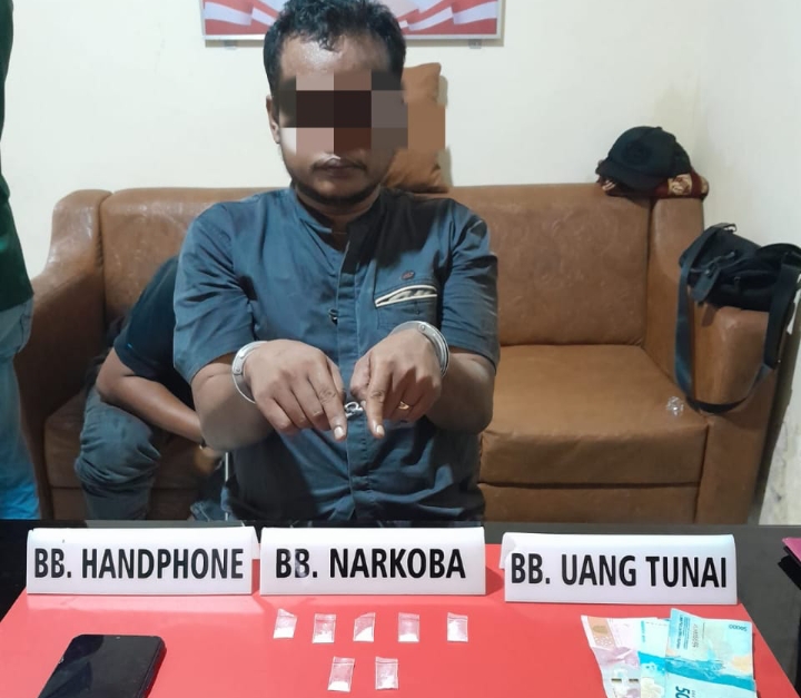 Barang bukti yang diamankan yaitu, 7 paket Narkoba jenis shabu-shabu yang dibungkus dengan plastik bening, (Bruto 1.17 Gram), HP merk Vivo, jam tangan, selembarkertaa timah rokok, uang hasil penjualan Ro 200 ribu.
