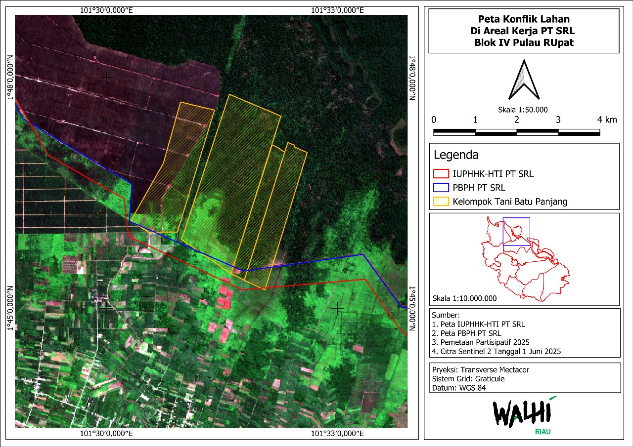 Berdasarkan hasil pantauan dan analisis spasial WALHI Riau periode November 2023 s/d September 2025 di lokasi konsesi PT SRL menemukan bahwa perusahaan tersebut menjadi sumber konflik lahan dengan masyarakat di Kabupaten Bengkalis, Kepulauan Meranti, dan Indragiri Hilir.