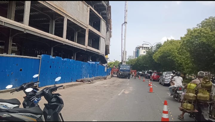 Kemudian, kegiatan pembangunan tersebut sangat menggangu arus lalu lintas dengan terlihatnya alat berat berupa crane terparkir ganteng di pinggir jalan hampir memakan setengah badan jalan.