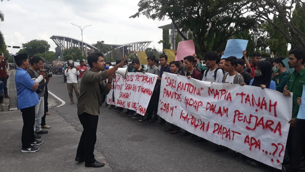 Dalam aksi mereka menuntut pihak polda riau segera naikkan status Sdr. SARI ANTONI sebagai tersangka dan segera ditahan serta meminta polda riau segera limpahkan berkas ke kejaksaan.