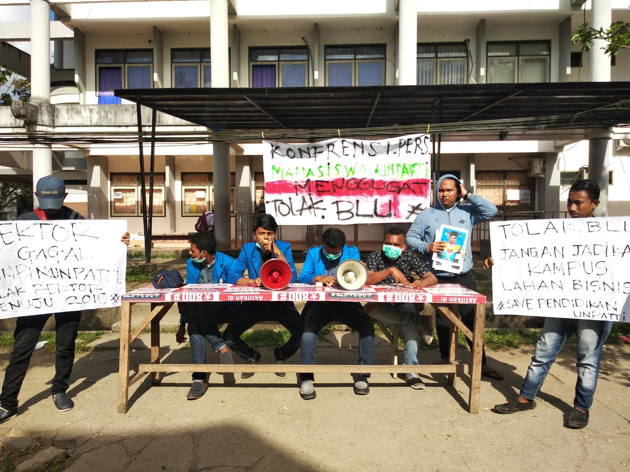 Kami dari gerakan mahasiswa unpatti menggugat menolak adanya keberalihan Universittas Pattimura Ambon untuk menjadi satus badan layanan umum. Secara indikator Unpatti ambon belum siap untuk menjadi BLU dikarenakan dari sisi penunjang belum cukup untuk pembiyayaan.