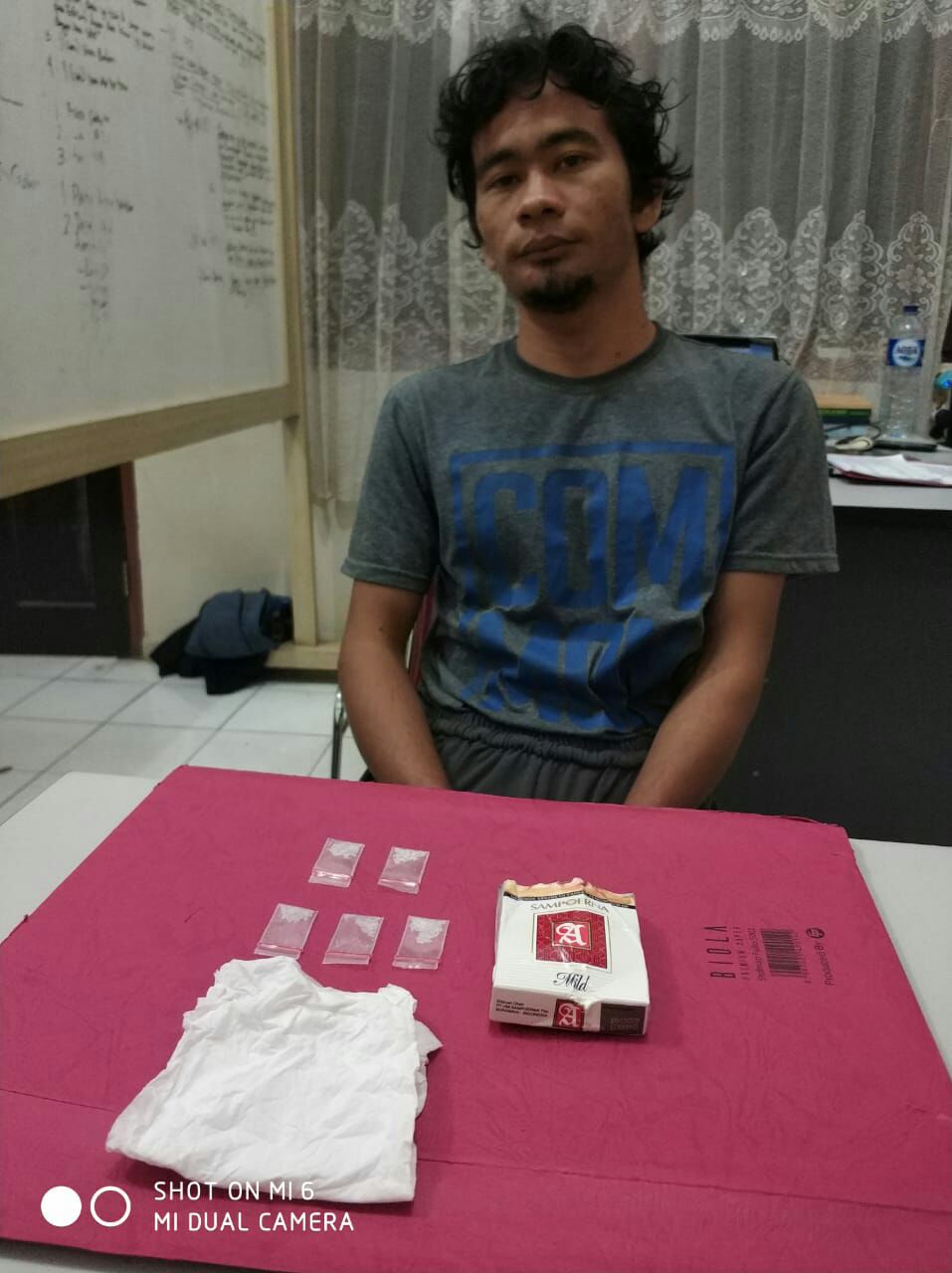 Ia ditangkap di Jalan Prof. M. Yamin SH Kelurahan Langgini Kecamatan Bangkinang Kabupaten Kampar. Dari tangannya berhasil diamankan barang bukti berupa 5 paket diduga narkotika jenis shabu yang dibungkus plastic bening, 1 lembar tisu warna putih, 1 buah kotak rokok merk sempurna, 1 unit sepeda motor supra warna hitam tanpa nomor polisi.