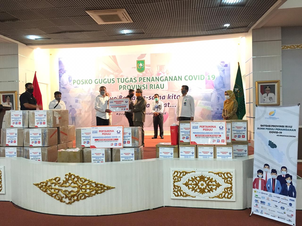 Penyalainews, Pekanbaru - PT. Pertamina (Persero) Retail Riau bersama SATGAS BUMN Peduli Penanganan Covid-19 Provinsi Riau serahkan bantuan peralatan medis berupa 650 Unit APD, 150 Liter Hand sanitizer dan 10 tabung LPG ukuran 50 Kg kepada Pemerintah Provinsi Riau dan Rumah Sakit di Gedung Balai Serindit.