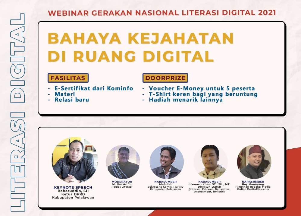 Penyalainews, Pelalawan - Kementerian Komunikasi dan Informatika bekerja sama dengan SIBERKREASI menggelar Webinar Gerakan Nasional Literasi Digital 2021 di Kabupaten Pelalawan dengan mengusung tema Bahaya Kejahatan Digital.